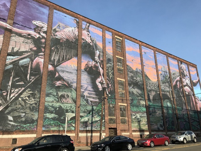 Recent two very large murals that have been painted by Kobra and Distort right near the Holland Tunnel. Kobra is a Brazilian street artists who has painted all of the world. The kaleidoscope effect is his signature. It was painted right after Bowie died and is 180 feet tall. Many murals in JC are very tall.